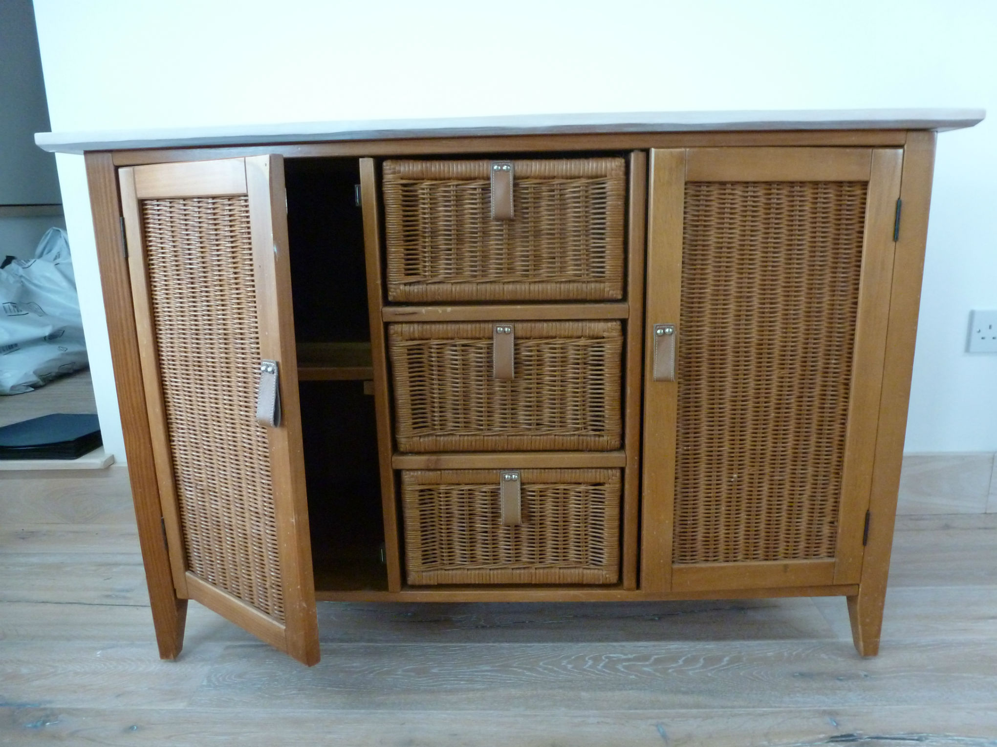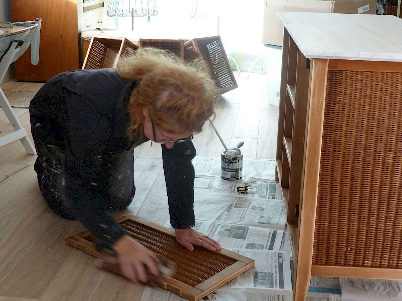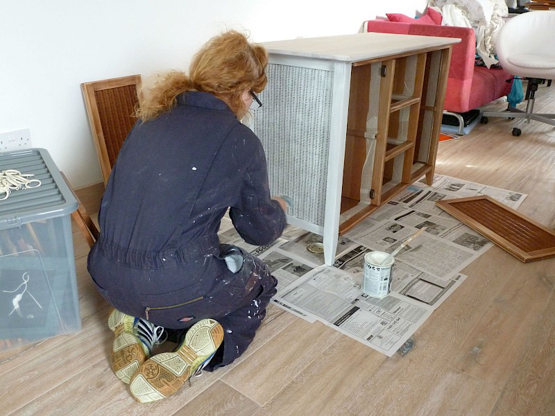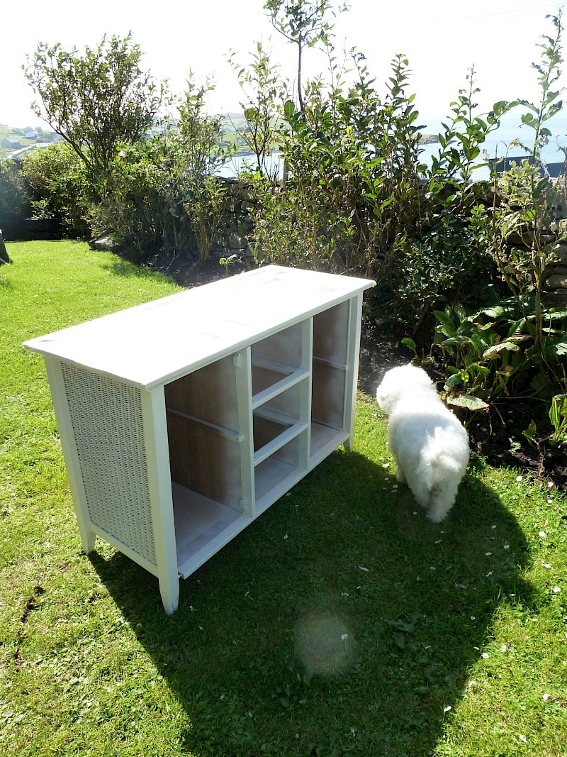Covered and masked the top with newspaper then spray-painted the drawers and sideboard with 2 coats of Antique matt paint on a beautiful calm summers day.