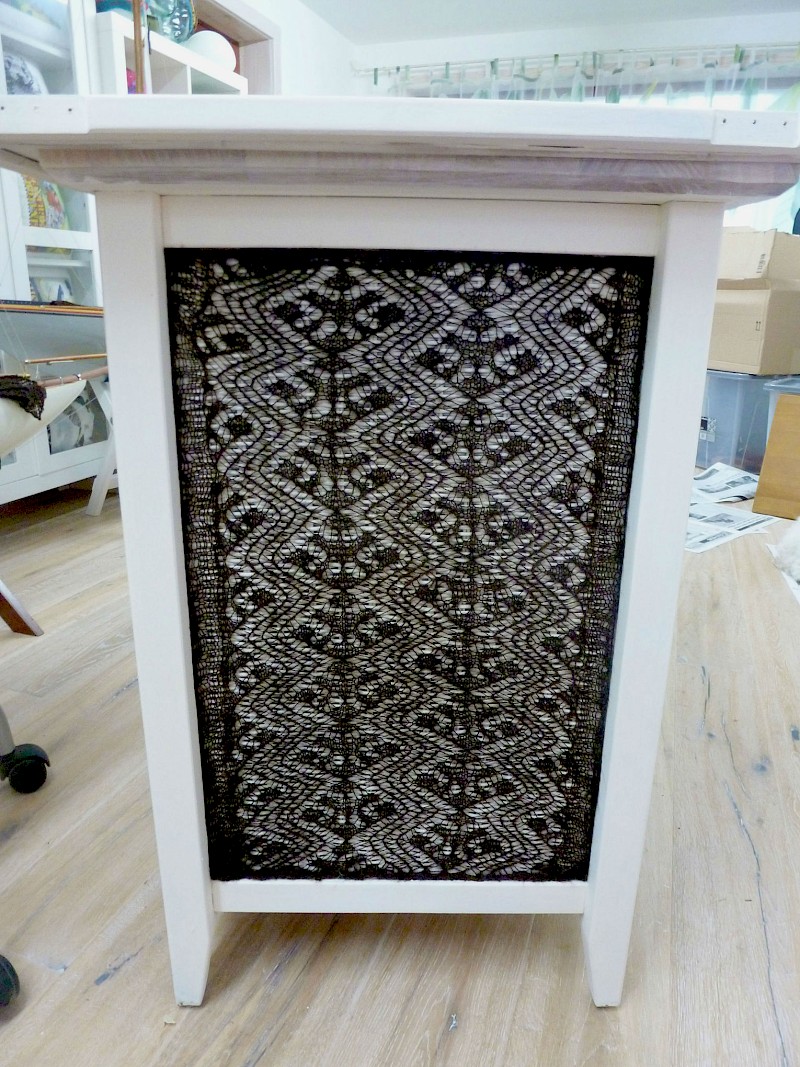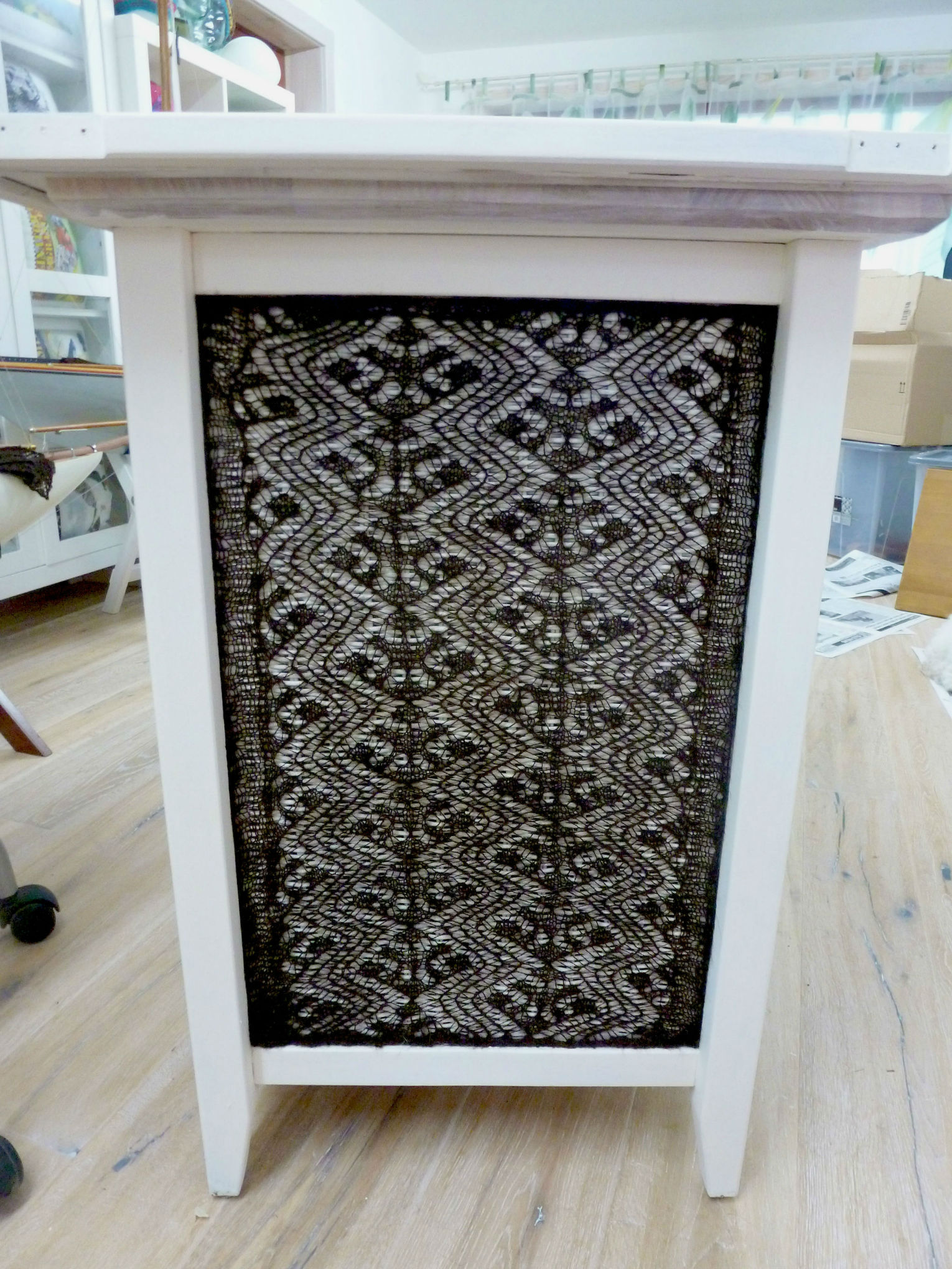 I had already done two up-cycled embossed furniture heirlooms but I couldn’t emboss the wicker so what was I to do, make Shetland fine lace panels of course! What could be more exquisite!