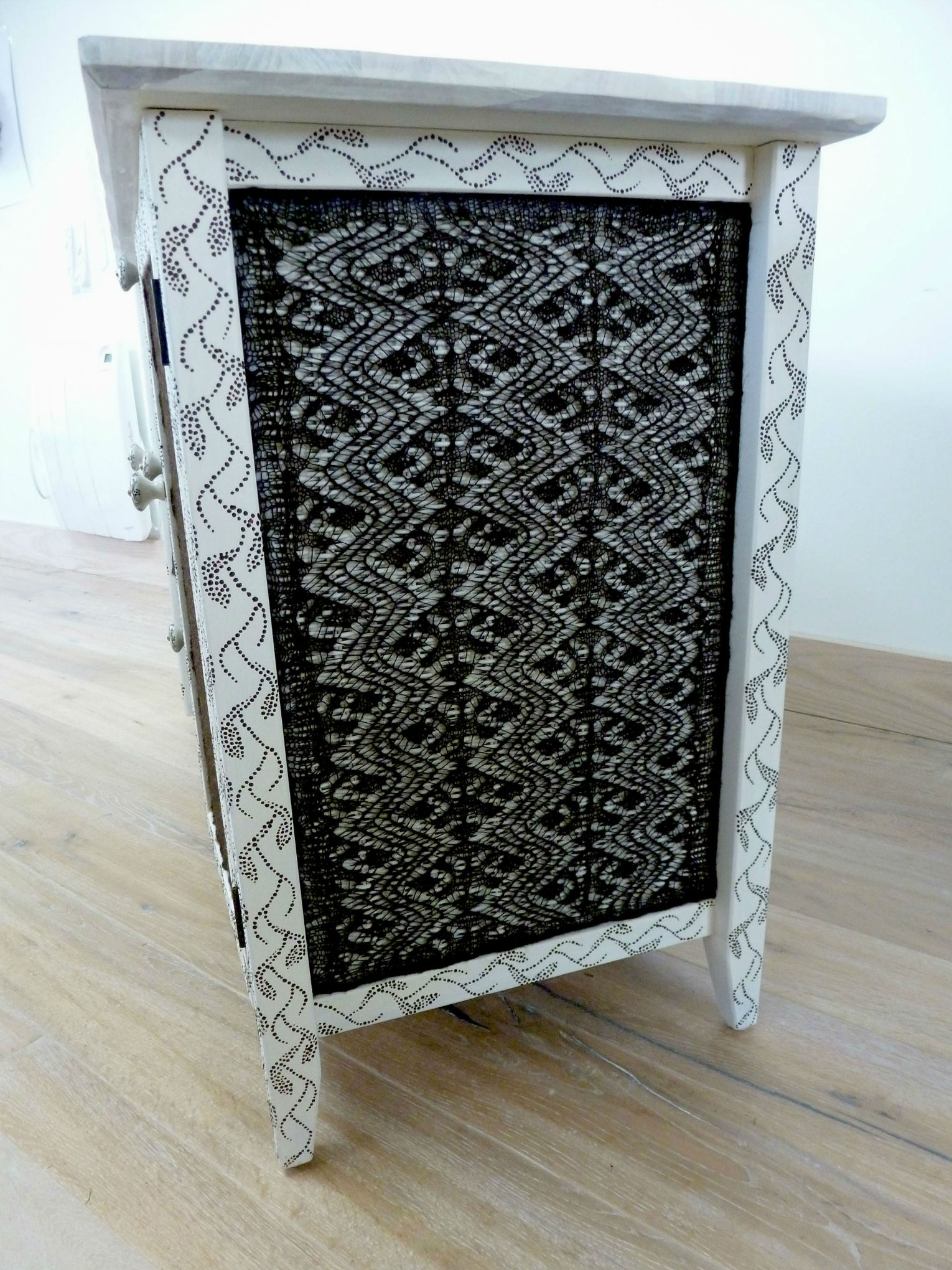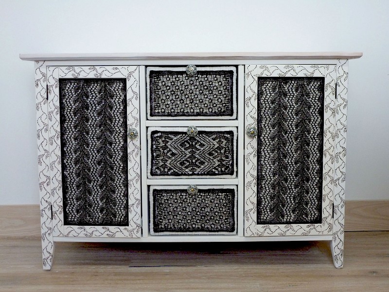 First ever up-cycled hand knit Shetland Fine Lace wool & embossed sideboard art-piece heirloom.
